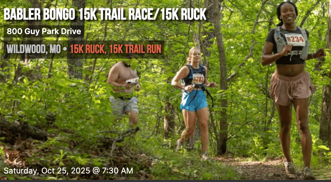 The Babler Bongo 15K Trail Race/15K RUCK is a loop course connecting Dogwood, Woodbine, Hawthorn and Equestrian trails at Babler State Park.