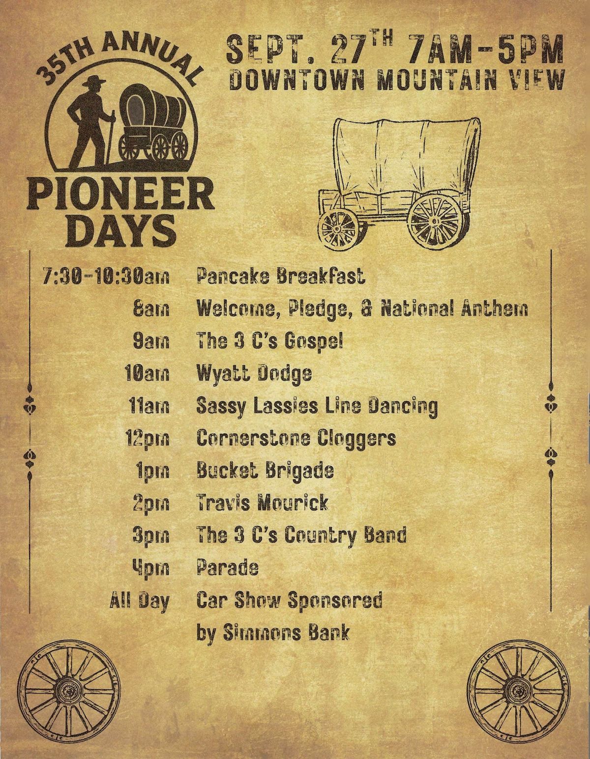 Meet downtown for a day full of history, crafts, music, and food! The 35th Annual Pioneer Day Festival will feature musicians such as Wyatt Dodge, The 3 C's country and gospel, and Travis Mourick. The Community Betterment will have its Ham and Bean supper on Friday night from 4 to 7 pm, and Saturday morning, the Chamber will start the day off with the Pancake Breakfast from 7:30 to 10:30 am.